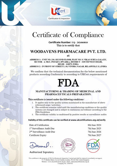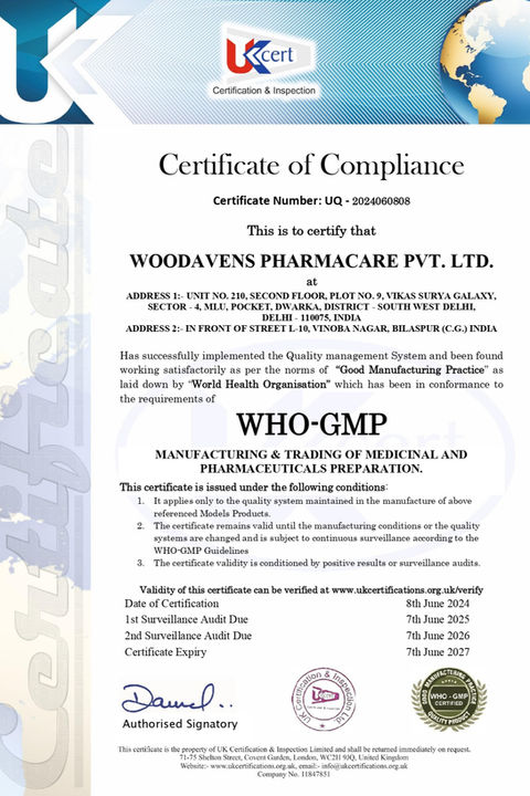 At Woodavens Pharma Care Pvt. Ltd., we are committed to the highest standards of quality, safety, and compliance. Our dedication to excellence is reflected in our prestigious certifications: